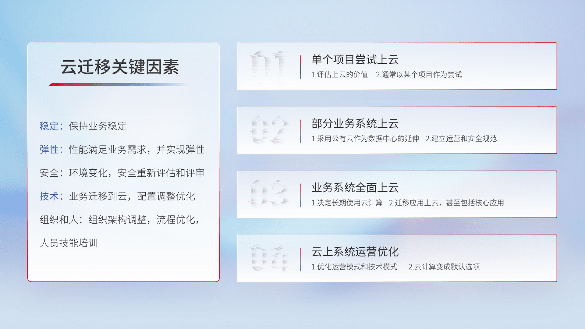 结合实际业务,,,从规划设计、、、云平台选型、、、、云原生改造、、、数据迁移、、、集成交付,,,,迁移全过程为客户识别最佳上云路径,,,做好风险识别管理,,,设计网络架构、、身份权限、、、安全审计合规、、、、操作审计、、日志审计、、、、监控告警策略、、、多站点容灾设计等,,对云上基础设施进行整体规划,,提升IT治理水平,,,以满足弹性、、、、高可用、、、、高性能的需求。。。